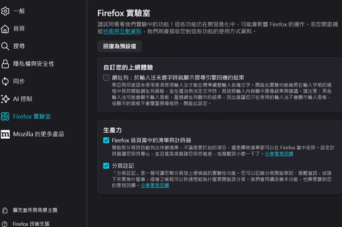 目前在 Firefox Labs 中測試的新功能,允許使用者為特定網頁加上簡短筆記。這對於需要標記為何保留該分頁、或是記錄後續待辦事項的場景非常方便,幫助你更有效率地管理瀏覽脈絡。